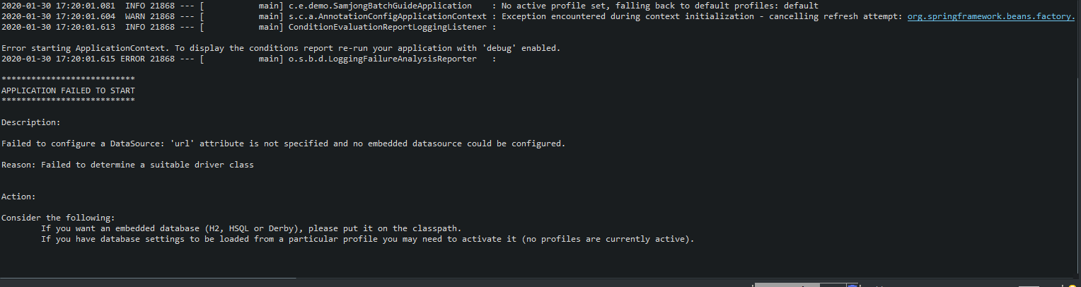 * 에러이유 : SpringBoot는 기본 설정들을 해주는데 이 설정에서 DataSource 설정이 없기떄문에 에러가 납니다