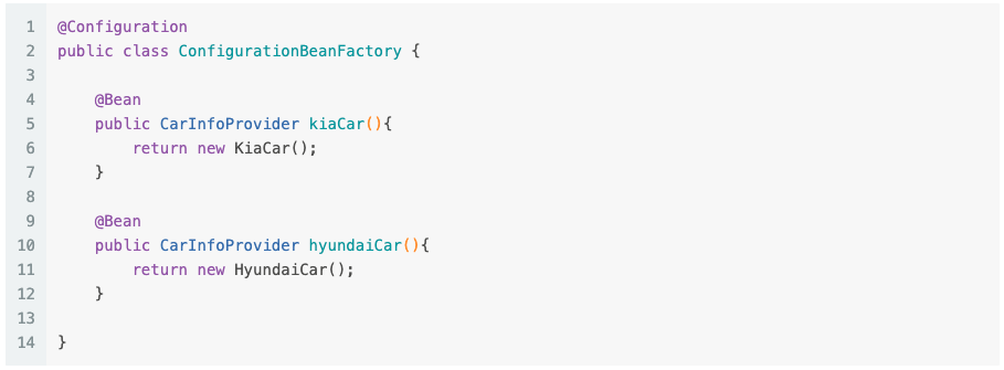 @Bean이 붙은 메서드명이 각각의 bean의 이름이 된다. 리턴되는 객체를 스프링 컨테이버가 빈으로 활용한다.