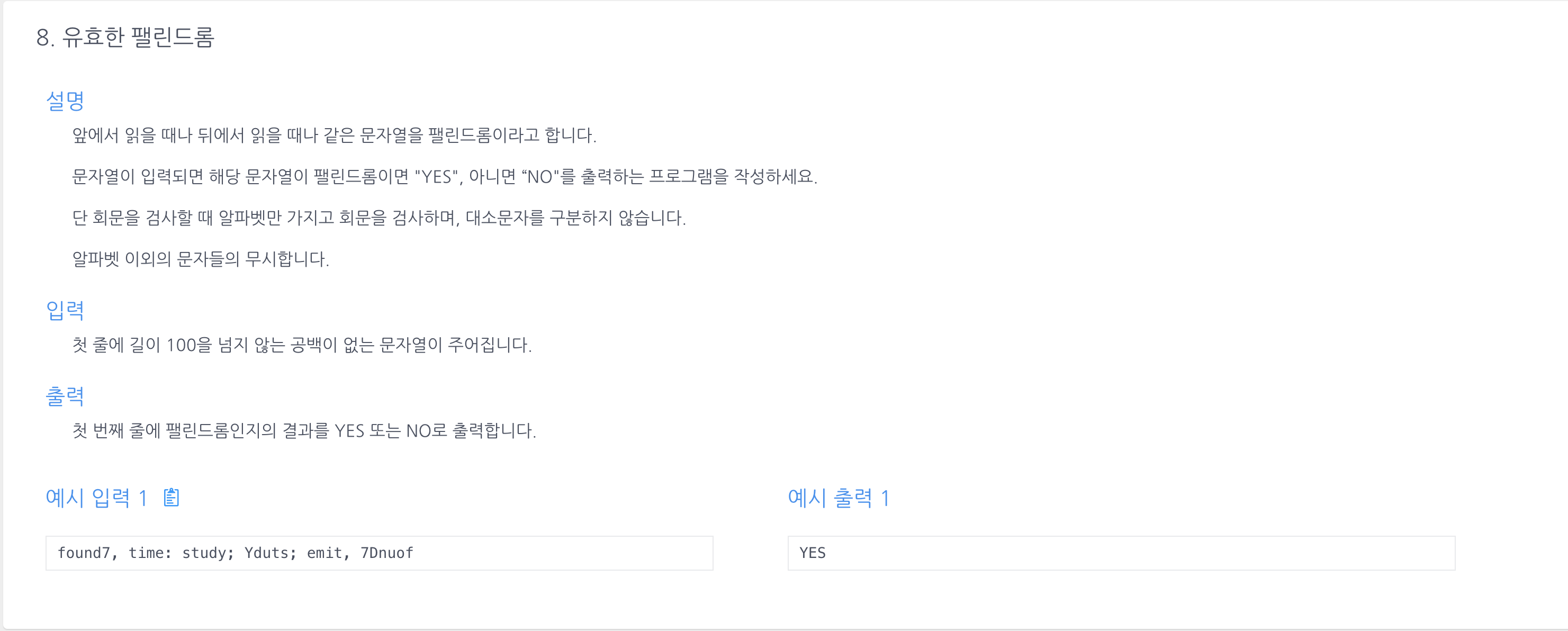 - equalsIgnoreCase 를 사용하여 대소문자 구분 없이 입력받은단어와 reverse한 단어가 일치하면 YES 아니면 NO 출력