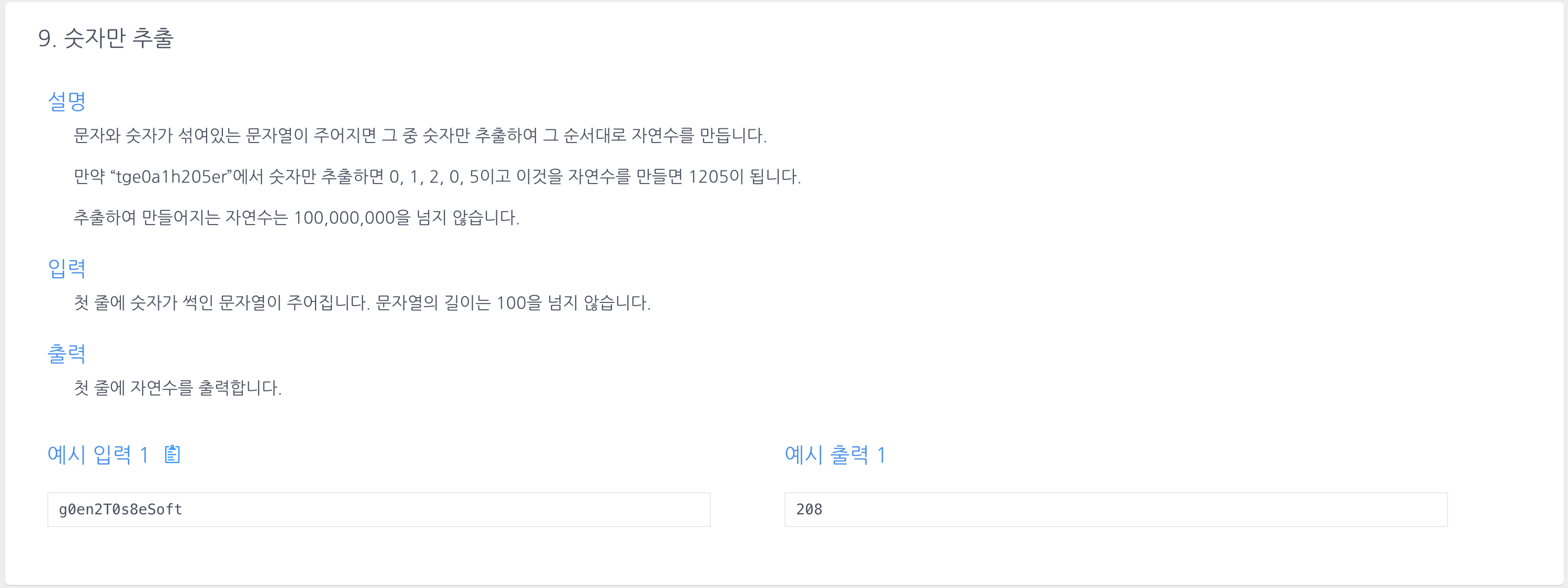 - 입력받는 단어를 CharArray로 변환하여 for loop 돌려 Character.isDigit 으로 숫자인지 확인하여 출력한다
