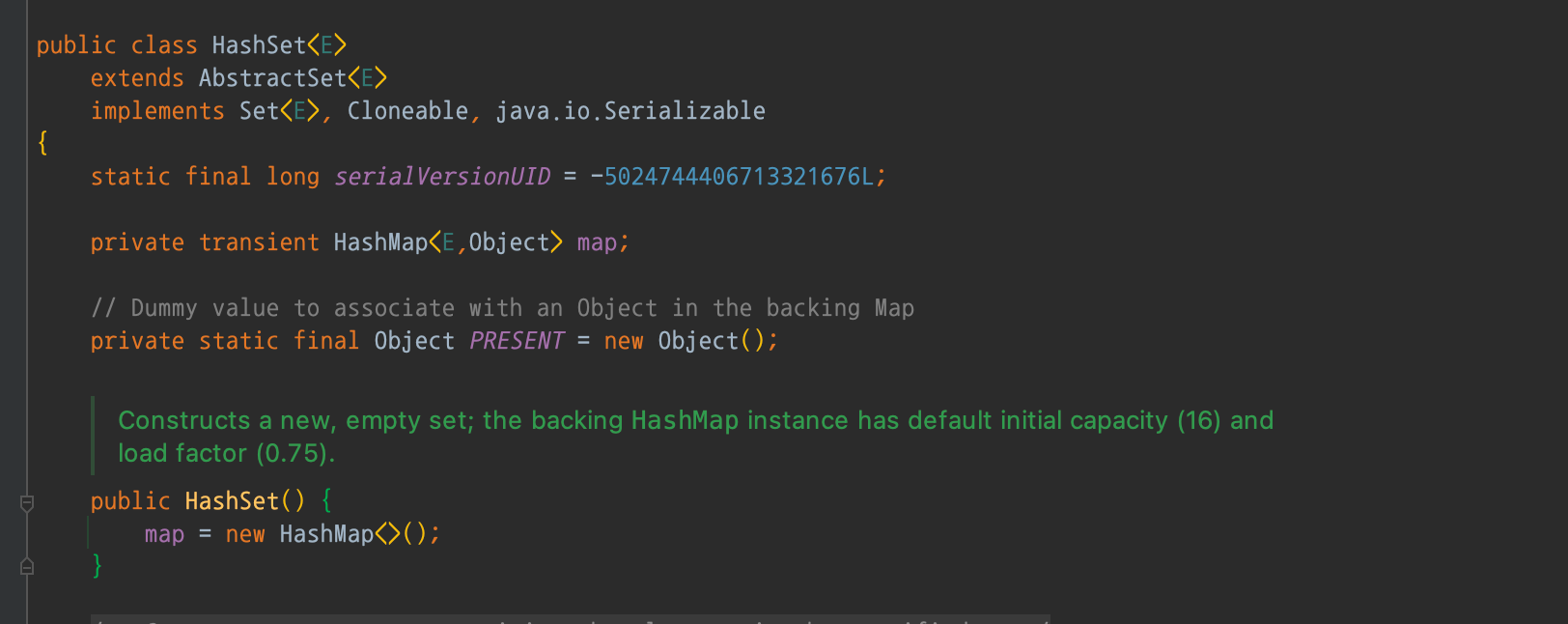 HashSet이 구현되어있는 클래스를 들어가보면 생성자에 HashMap이 인스턴스 되어있는것을 확인할수 있다
