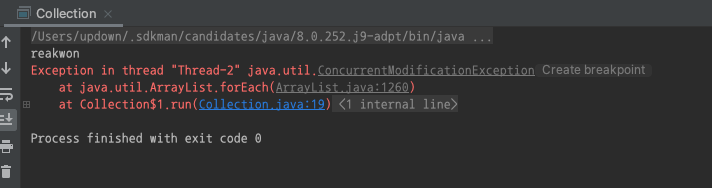 위 코드처럼 ArrayList로 다른 스레드에서 값을 수정하려고 접근 하였을때 Exception이 발생되었고