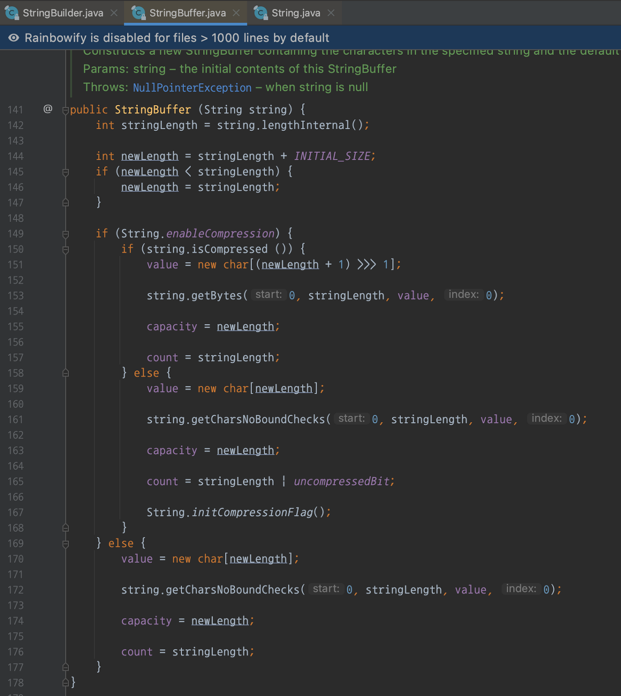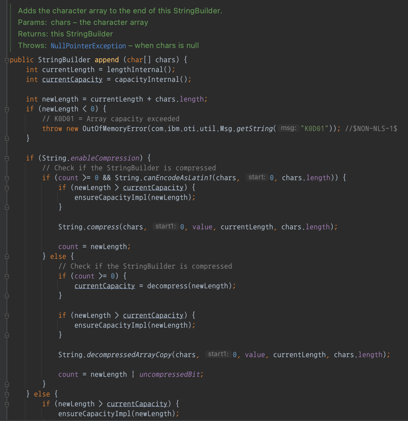 - thread safe 하다 ( 이러한 이유로 StringBuilder 보다 성능이 떨어진다 )