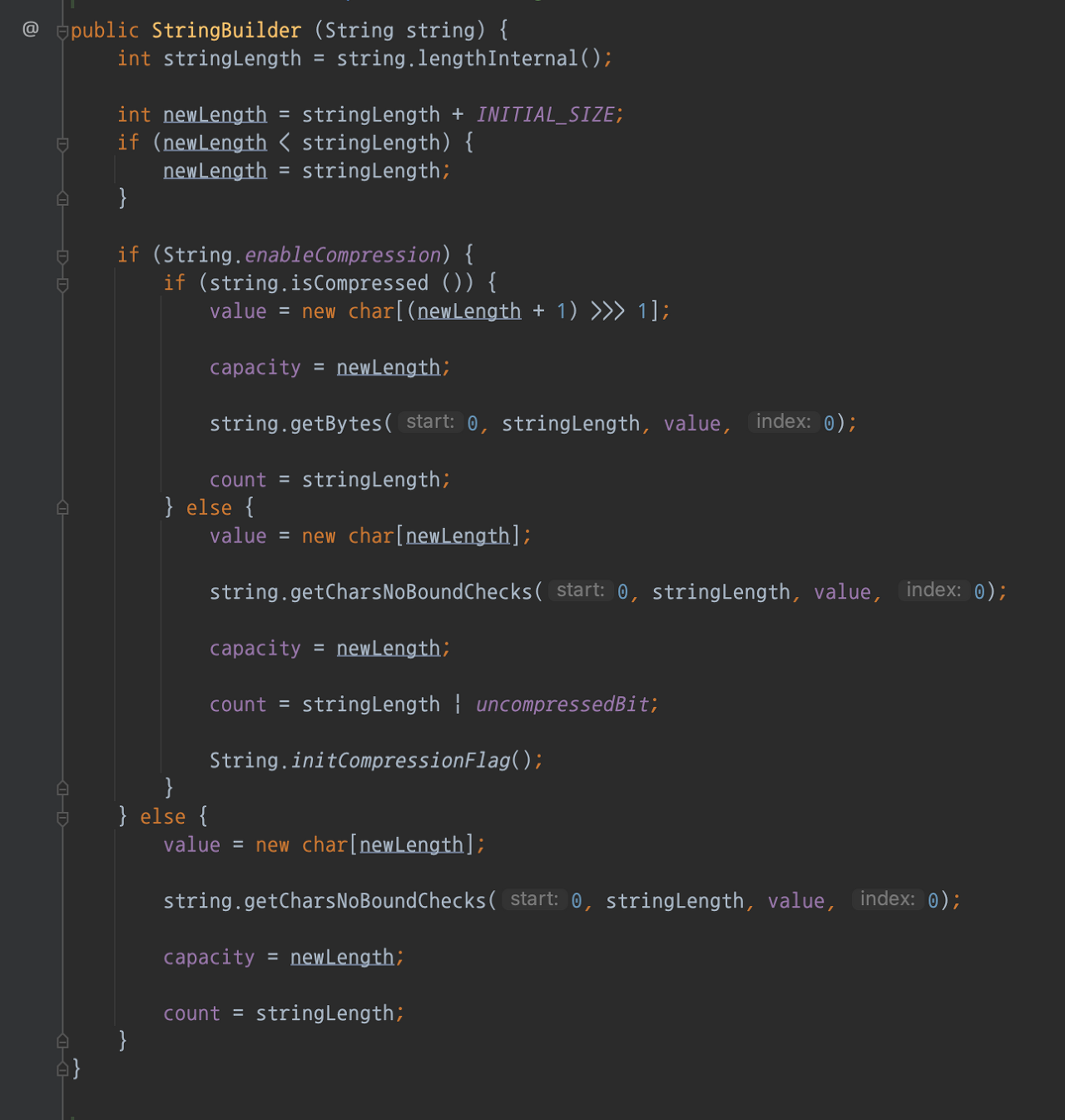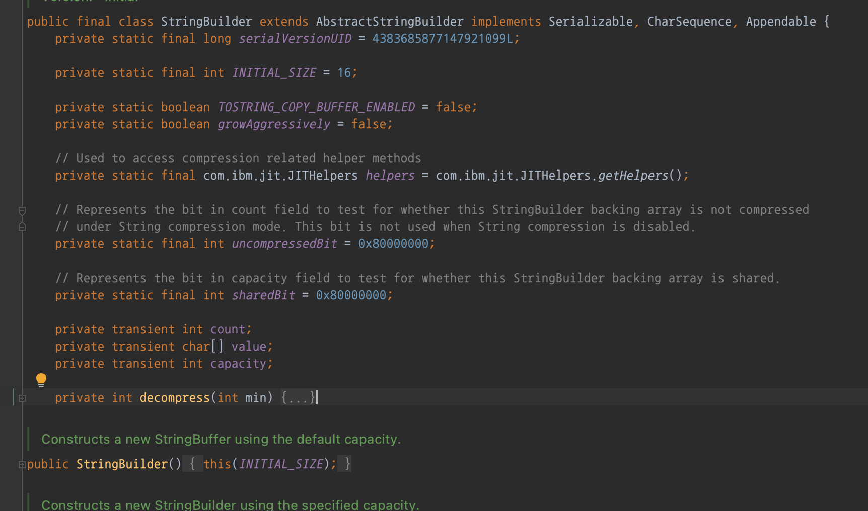 - StringBuilder 클래스는 내부적으로 버퍼(buffer)라고 하는 독립적인 공간을 가집니다. 하지만 인스턴스 생성 시 사용자가 설정한 크기보다 언제나 16개의 문자를 더 저장할 수 있도록 여유 있는 크기로 생성됩니다. 버퍼 크기의 기본값은 16개의 문자를 저장할 수 있는 크기이며, 생성자를 통해 그 크기를 별도로 설정할 수도 있습니다.