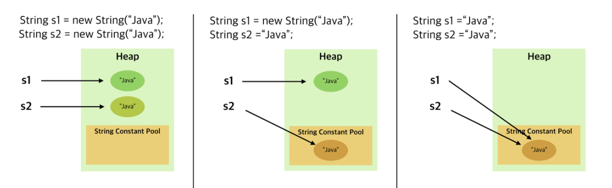- String은 참조형 변수 이기 때문에 선언할때마다 새로운 객체를 생성하고 그 객체를 바라보는 주소값을 가지게 된다