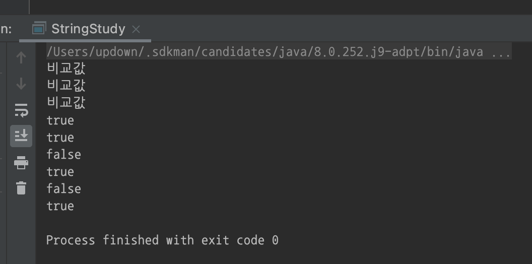 라고 생각할수 있다 그러나 true가 출력된것을 확인할수 있다 - == 가 true를 출력한 이유는 String 객체를 literal로 생성하면 해당 String 값은 Heap 영역 내 "String Constant Pool"에 저장되어 재사용되기 때문에 같은 주소값을 가진다