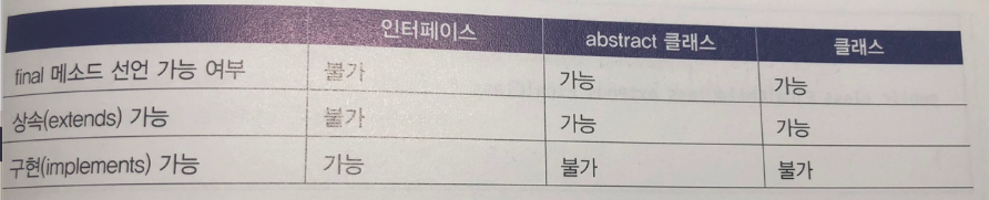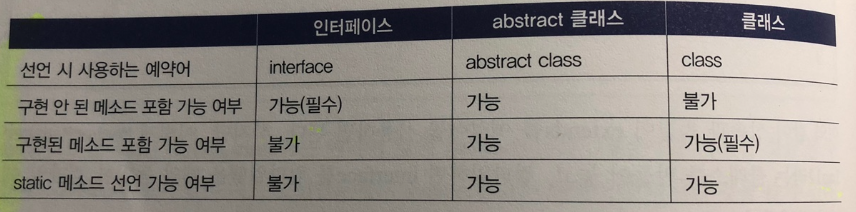 - 일종의 추상 클래스이다. 추상클래스처럼 추상메서드를 갖지만 추상클래스보다 추상화 정도가 높아서 추상 클래스와 달리 일반 메서드 또는 멤버변수를 가질 수 없다. 오직 추상메서드와 상수만 멤버로 가질 수 있다. 하지만 자바 8 부터 default 키워드를 통해 일반 메서드 구현이 가능해졌다.